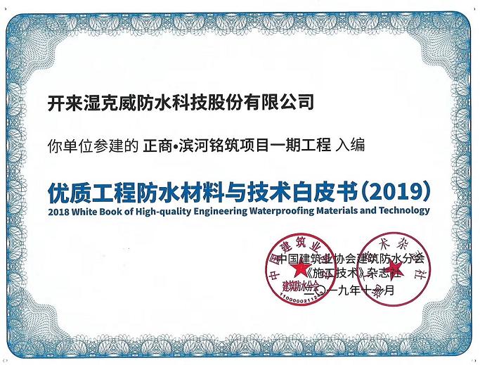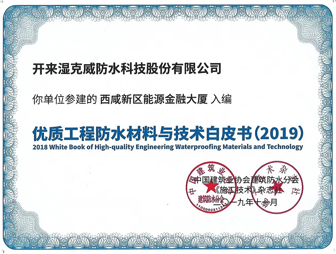 11月14-16日,中國建筑業協會建筑防水分會2019年會暨防水產業鏈發展論壇在上海召開, 會上中國建筑業協會建筑防水分會和《施工技術》雜志社聯合發布了《優質工程防水材料與技術白皮書(2019版)》。開來濕克威防水科技股份有限公司參建的西咸新區能源金融大廈、正商?濱河銘筑一期工程等優質工程項目入選。