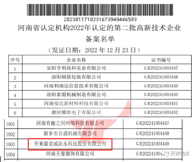 近日,開(kāi)來(lái)濕克威防水科技股份有限公司順利通過(guò)《高新技術(shù)企業(yè)認(rèn)定管理辦法》(國(guó)科發(fā)火字〔2016〕32號(hào))和《國(guó)家高新技術(shù)企業(yè)認(rèn)定管理工作指引》(國(guó)科發(fā)火字〔2016〕195號(hào))有關(guān)規(guī)定,在科技部火炬高技術(shù)產(chǎn)業(yè)開(kāi)發(fā)中心于關(guān)于對(duì)河南省認(rèn)定機(jī)構(gòu)2022年認(rèn)定的第二批高新技術(shù)企業(yè)進(jìn)行備案的公示名單中,開(kāi)來(lái)濕克威防水科技股份有限公司正式被評(píng)定為國(guó)家級(jí)高新技術(shù)企業(yè)!
