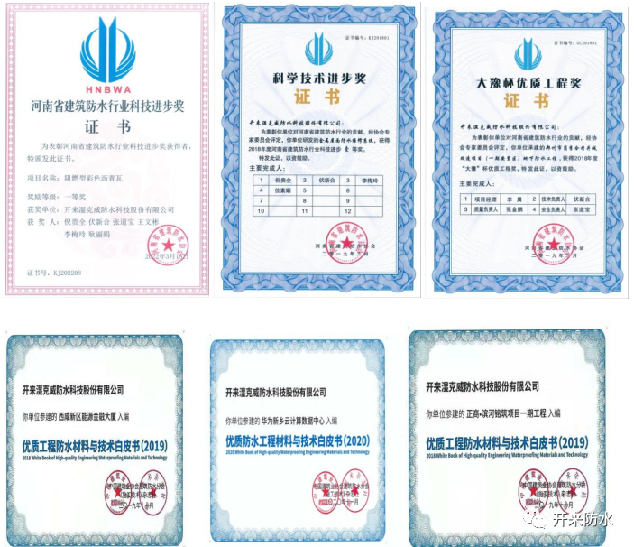公司開(kāi)展的研發(fā)多項(xiàng)成果獲得行業(yè)領(lǐng)域的高度評(píng)價(jià),其中“阻燃型彩色瀝青瓦”成果榮獲河南省建筑防水協(xié)會(huì)2021年度科技進(jìn)步一等獎(jiǎng);“金屬屋面防水修繕系統(tǒng)”獲得河南省建筑防水協(xié)會(huì)頒發(fā)的科技進(jìn)步獎(jiǎng)一等獎(jiǎng),“鄭州市崗李合村并城改造項(xiàng)目(一期安置區(qū))地下防水工程”成果榮獲河南省建筑防水協(xié)會(huì)“大豫杯”優(yōu)質(zhì)工程獎(jiǎng),西咸新區(qū)能源金融大廈、華為新鄉(xiāng)云計(jì)算數(shù)據(jù)中心、正商·濱河銘筑一期工程分別入選中國(guó)建筑業(yè)協(xié)會(huì)建筑防水分會(huì)和建筑施工技術(shù)雜志社辦法的優(yōu)質(zhì)工程防水材料與技術(shù)白皮書。開(kāi)來(lái)濕克威的知名度和行業(yè)影響力得到快速提升。