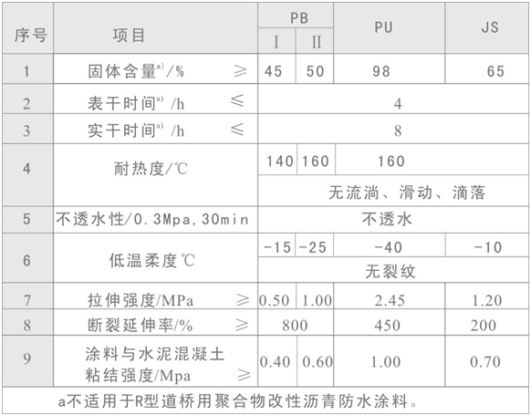 (1)產品按材料性質分:道橋用聚合物改性瀝青防水涂料(PB),道橋用聚氨酯防水涂料(PU),道橋用聚合物水泥防水涂料(JS)。